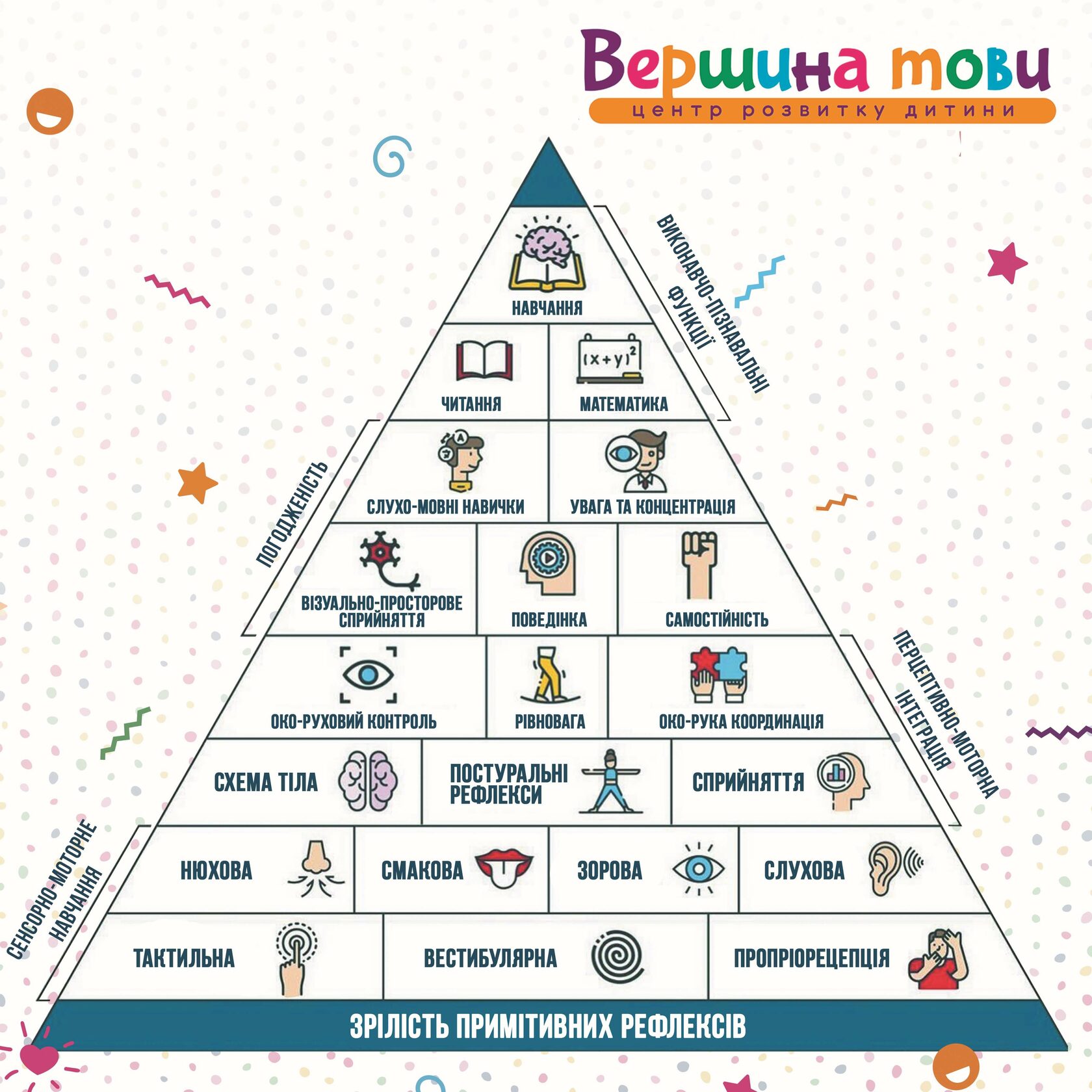 Основою цієї моделі є факт того, наскільки все навчання дитини, її інтелект, поведінка, мова залежить від нижніх поверхів піраміди, і особливо від фундаменту, нервової системи та зрілості примітивних рефлексів. Не забезпечивши розвиток дитини на нижніх "поверхах" ми не можемо вимагати формування навички, яка знаходиться на більш високих рівнях піраміди навчання. Саме це ми пояснюємо батькам, які залишаються здивовані після поради логопеда зайнятися фізкультурою, мозочковою стимуляцією, розвитком моторики. У розумінні більшості мова-якась окрема структура і займається їй логопед, який просто покаже дитині, куди ставити язик і та відразу заговорить. Але мова - це вища психічна функція, що знаходиться не в основі піраміди, не збоку і не окремо, а на самій Вершині. І щоб до неї дістатися, треба приділити увагу кожному "поверху" центральної нервової системи.